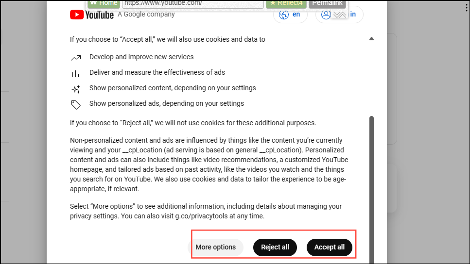 - When you click on the YouTube link, it will launch the proxy and take you to the YouTube page. You will see a notification about cookies, which you can accept or reject by clicking on the respective button at the bottom.