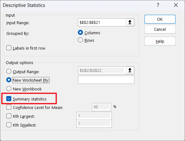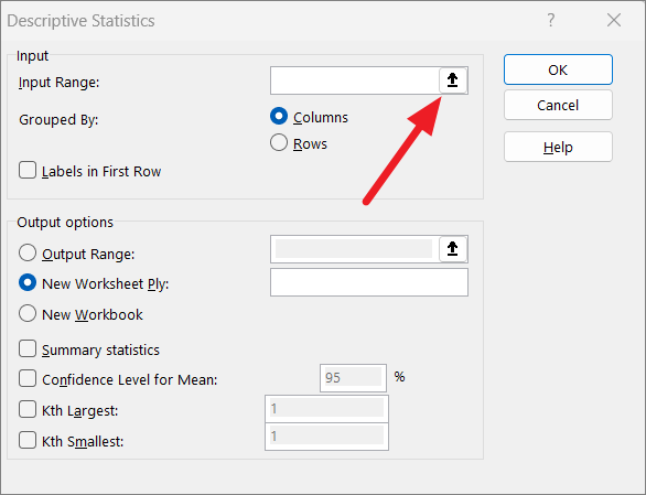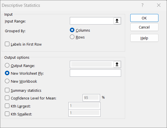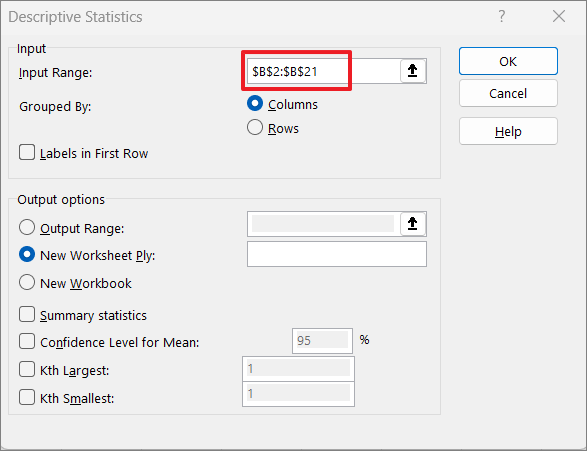 This will open the Descriptive Statistics dialog box where you need to configure the Input and Output options.