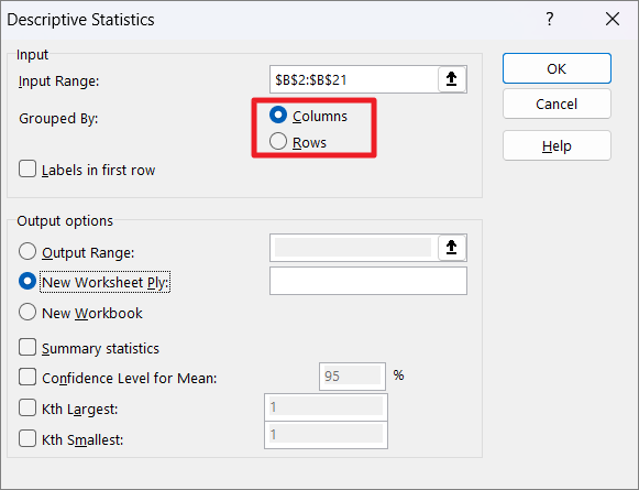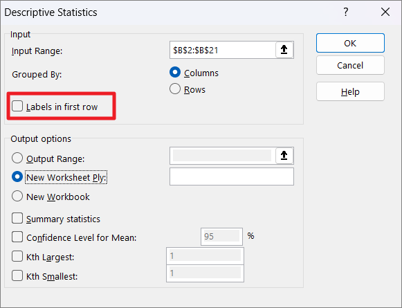 Labels in first row: If you selected or entered the range (in the Input Range) with headers, you should tick this option. In this example, we selected the input range without the labels, so we left it unchecked.