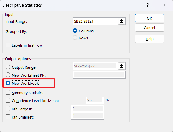 Output Range: Select where you want to display the statistics result. If you want to display the result in the current worksheet or other worksheets, click the ‘Output Range’ radio button and specify the range in the field next to it.