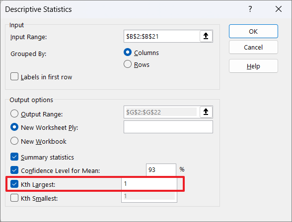 Kth Largest: This option will display the largest value in the data set. When you select this option, the default value is 1 which means it will display the first largest value. If you enter ‘2’, it will display the second largest value, 3 will show the third largest value, and so on.