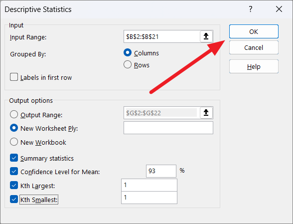 Let’s see how you should fill each field in the Descriptive Statistics dialog box.