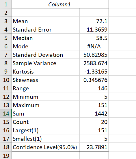 The Data Analysis tool enables you to perform advanced analysis on your data and automatically generate a series of 16 key statistics for your data. But if you only want to find certain statistics for your data (such as means, Standard deviation, etc), you can use individual formulas to calculate each statistical measure. These formulas will produce the same result as the Data Analysis tool.