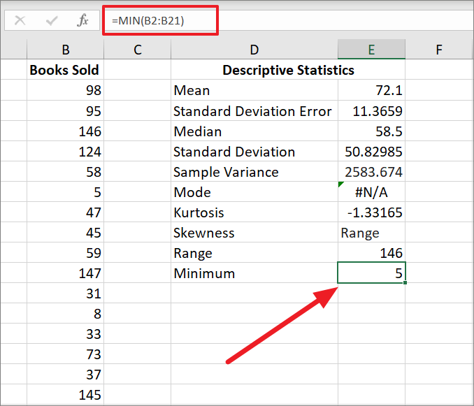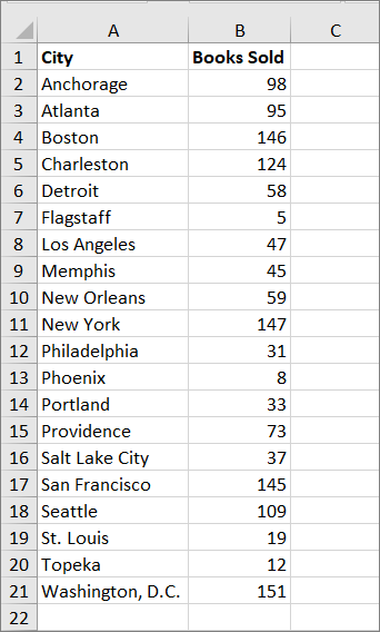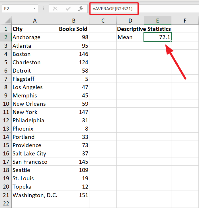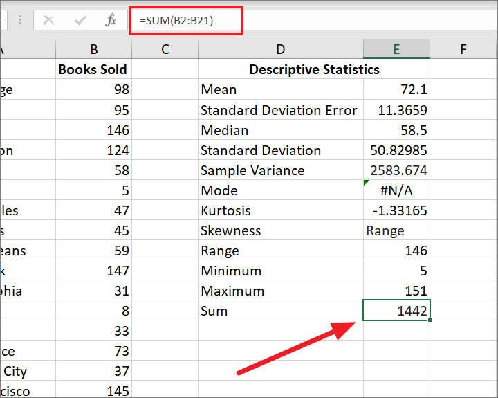 Suppose, you have the below sample data set where we have the number of books sold in different cities. For this data set, we want to calculate descriptive statistics. Here’s how you can do that: