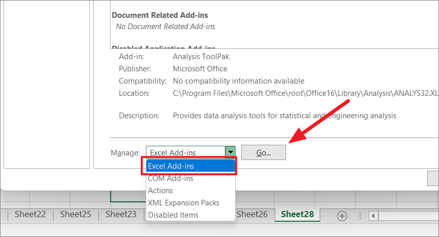 At the bottom of the right pane, choose ‘Excel Add-ins’ from the Manage drop-down and click on ‘Go..’.