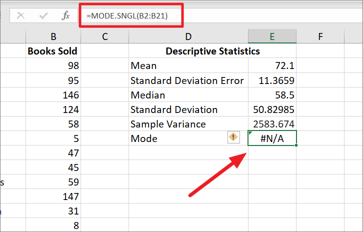 - Mode – This represents the value that appears most frequently in the sample data. This statistical value is useful for categorical and ordinal data. In the above example, there is no most common value, so we get #N/A.