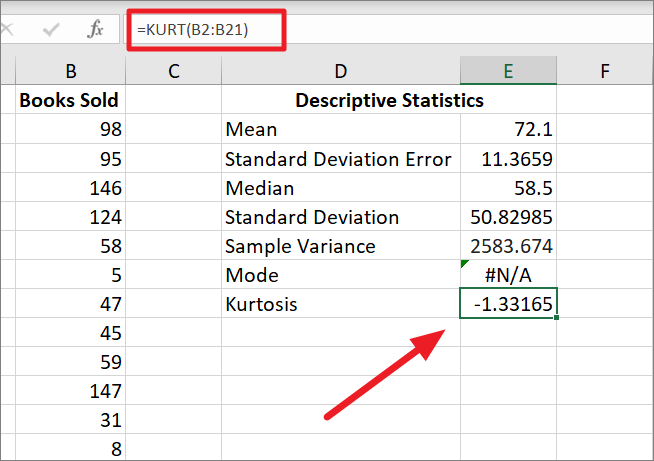 - Kurtosis – Kurtosis value is a measure of how tips/peaks and tails of your distribution differ from the normal distribution. The normal distribution usually has a Kurtosis value of 0. If the kurtosis value is positive, it means your distribution is a peaked distribution and negative values indicate a relatively flat distribution.
