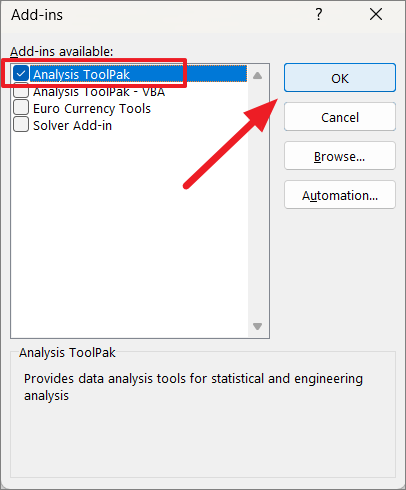 A new Add-ins dialog box will pop up. Here, tick or select the ‘Analysis ToolPak’ option and click ‘OK’.