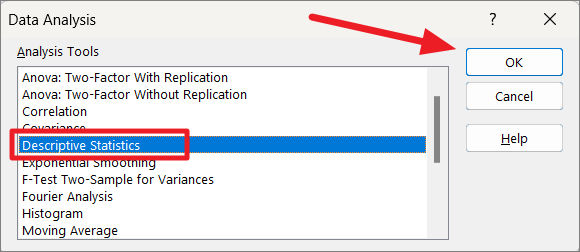In the Data Analysis dialog window, select ‘Descriptive Statistics’ under Analysis Tools and click ‘OK’.