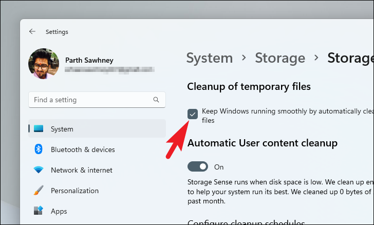 Step 6: On the Storage Sense settings page, check the box under Automatic User content cleanup to allow Windows to automatically delete temporary system and app files.