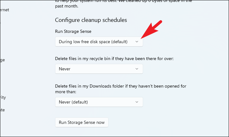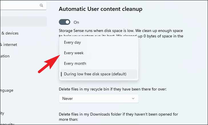 Step 7: To set up a cleanup schedule, navigate to the Configure cleanup schedules section. Click on the drop-down menu under Run Storage Sense and select your preferred frequency (e.g., every day, week, or month).