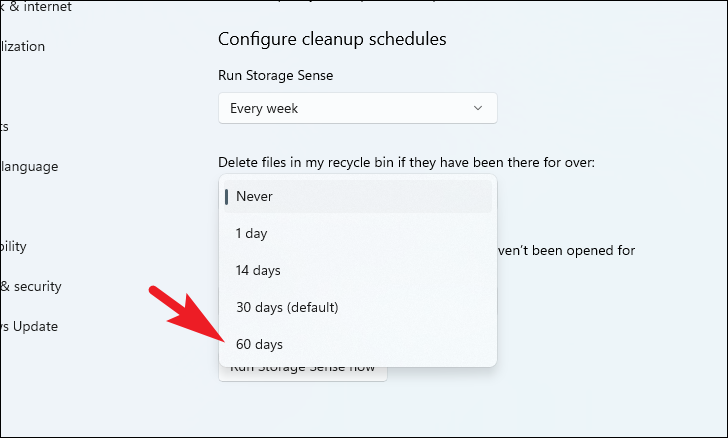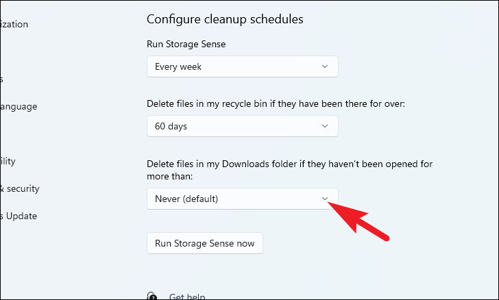 Step 9: If you want Storage Sense to delete files in your Downloads folder that haven't been opened for a certain period, select the desired time frame from the drop-down menu under Delete files in my Downloads folder if they haven't been opened for more than.