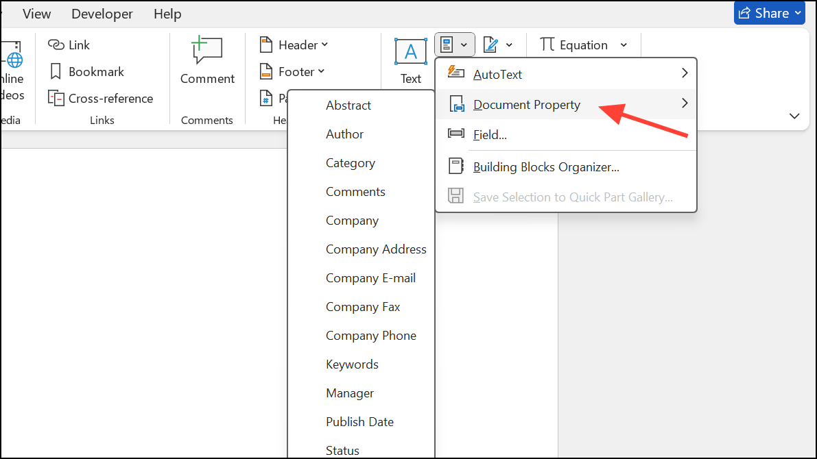 Step 1: Open your Word document and go to the Insert tab. In the Text group, select Quick Parts, then hover over Document Property. You’ll see a dropdown list of built-in properties such as Title, Author, Company, and more.
