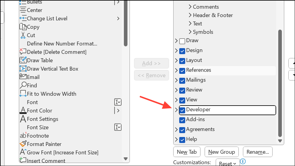Step 1: Enable the Developer tab in Word by right-clicking the ribbon, selecting Customize the Ribbon, and checking Developer.