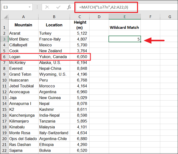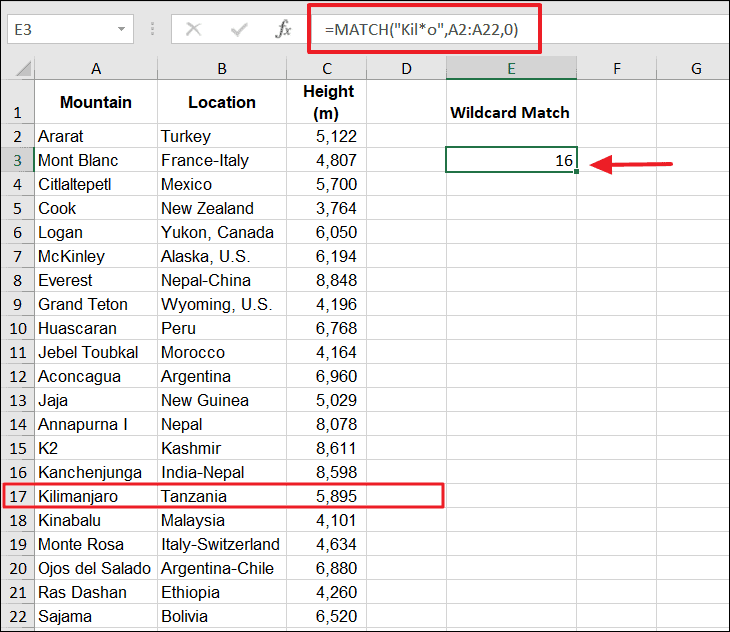 =MATCH("Kil*o", A2:A22, 0)This formula will match "Kilimanjaro" in the list, and the function returns its position.
