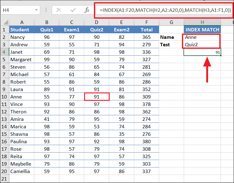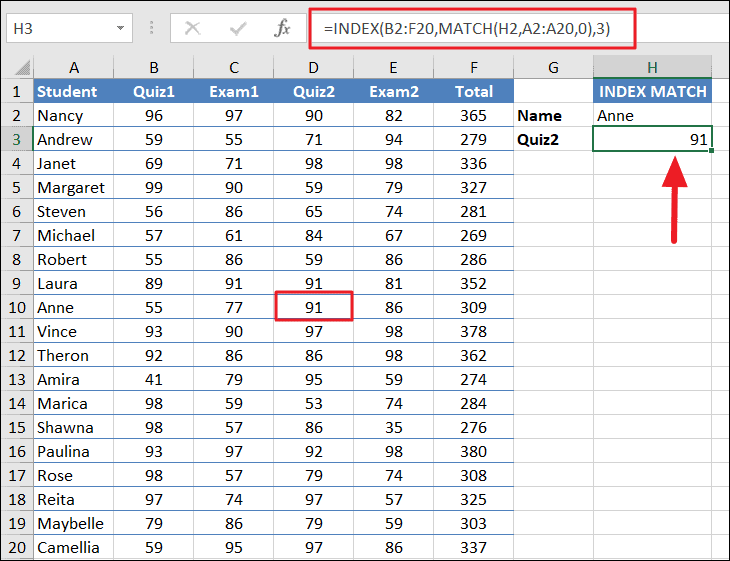 =INDEX(array, row_num, [column_num])For example, suppose you have a dataset of students' scores, and you want to retrieve the score of a specific student in "Quiz2". You can use the combined INDEX and MATCH functions as follows:
