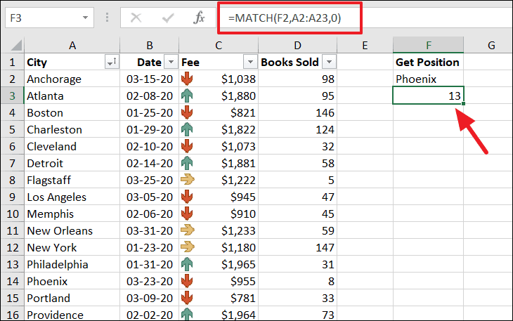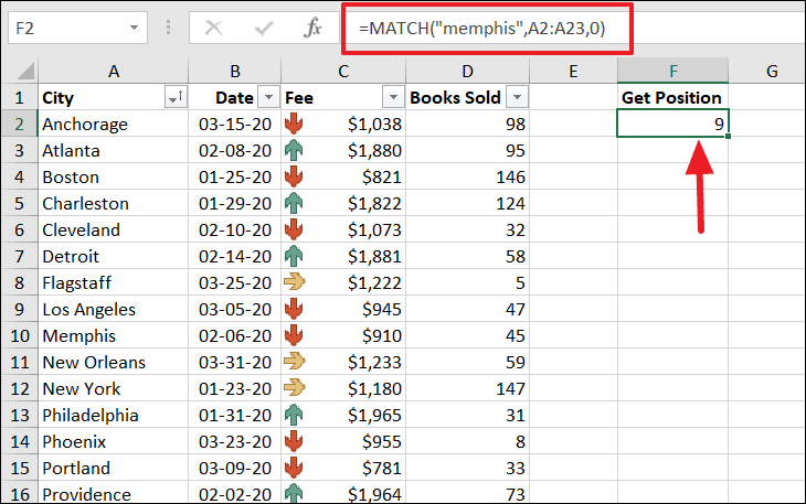 =MATCH("memphis", A2:A23, 0)The third argument is set to 0 to find an exact match. Notice that even though "memphis" is entered in lowercase in the formula, and "Memphis" in the dataset has an uppercase "M", the function still finds the match because the MATCH function is not case-sensitive.