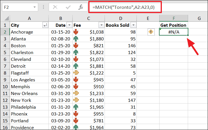 =MATCH(F2, D2:D23, 1)If the exact value in F2 is not found, the function returns the position of the next smallest value.