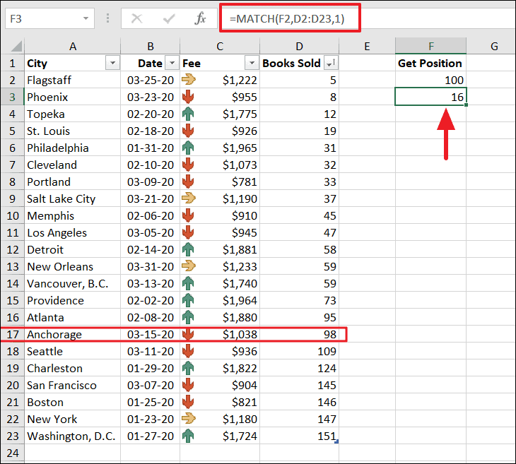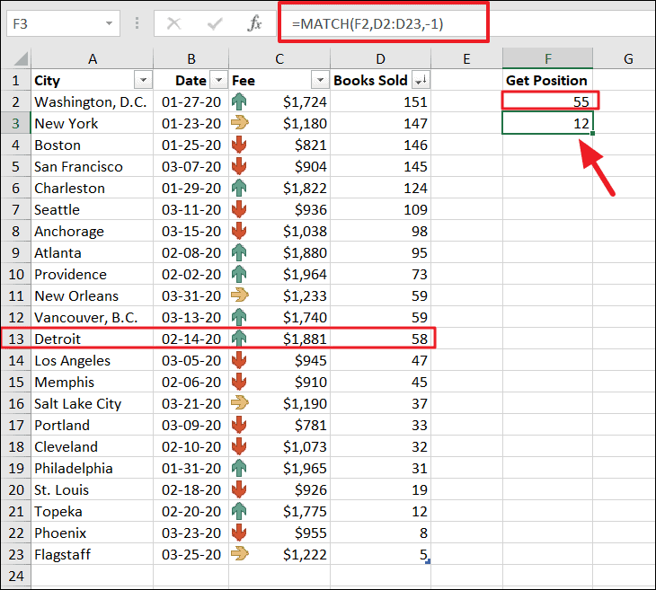 =MATCH(F2, D2:D23, -1)Assuming the values in D2:D23 are sorted in descending order, if an exact match is not found, the function returns the position of the next largest value.