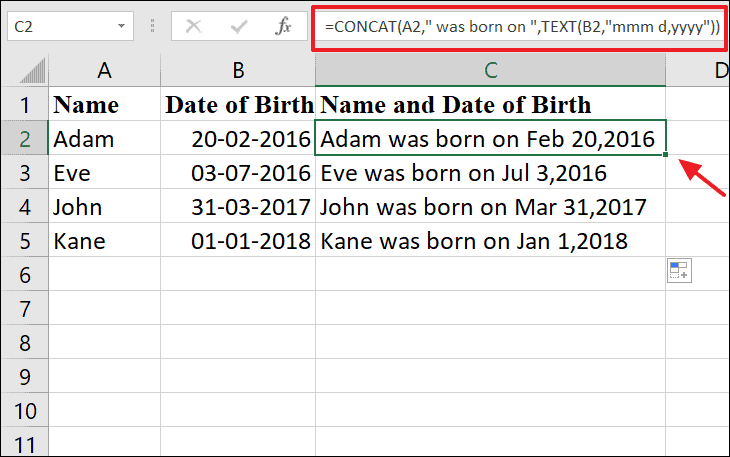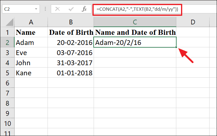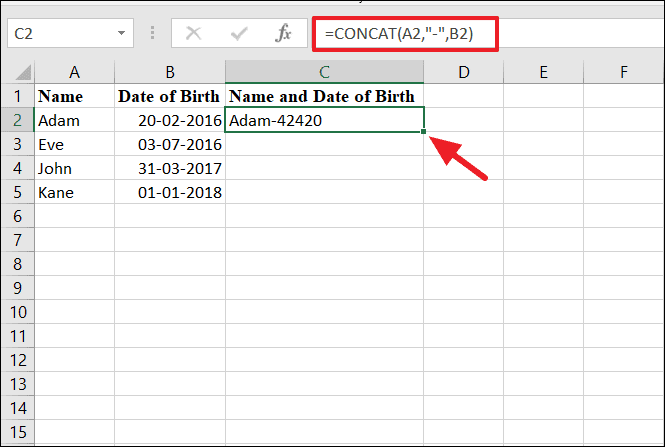 If you have names in column A and their dates of birth in column B, directly concatenating them might result in the date appearing as a serial number.