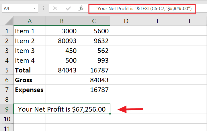 = "Your Net Profit is " & TEXT(C6 - C7, "$#,###.00")This formula calculates the net profit by subtracting Expenses from Gross and then formats the result as currency, appending it to the string "Your Net Profit is".