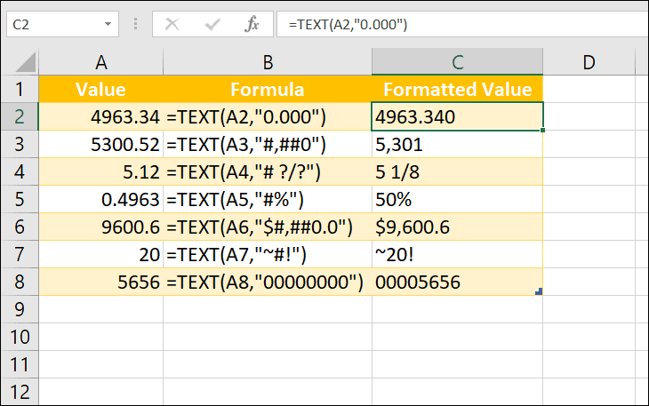 Below is a table with various TEXT function formulas applying different formats to numeric values. You can try these formulas in your spreadsheet: