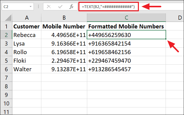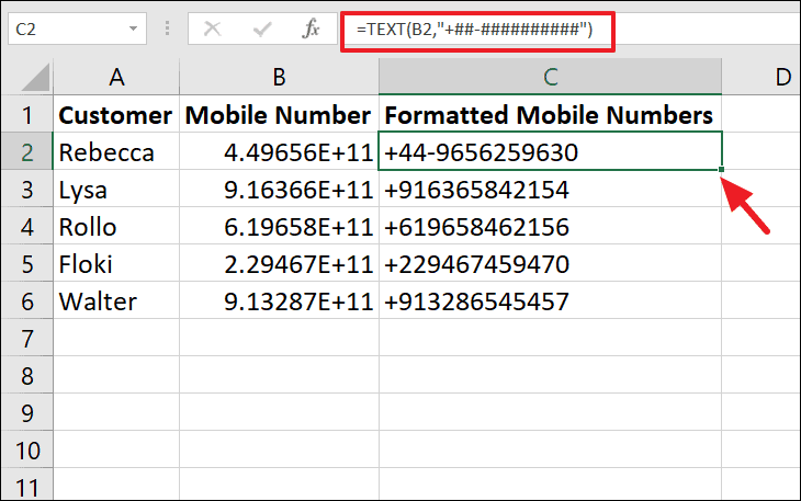 To format these numbers back into readable mobile numbers, use the formula: