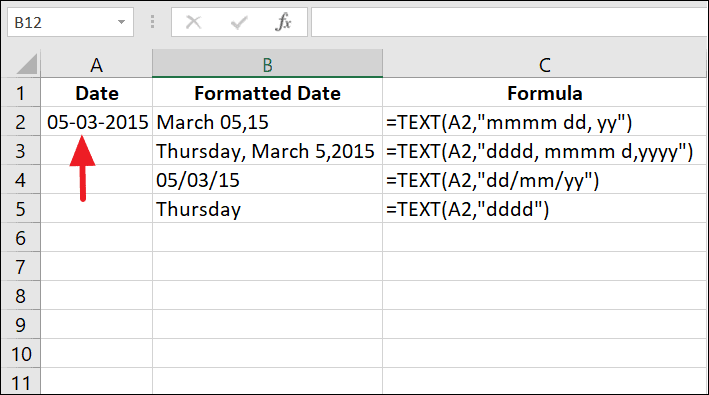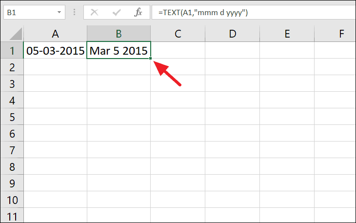 If you have a date in cell A1 (e.g., 05-03-2015) and want to display it as 'Mar 5, 2015', use: