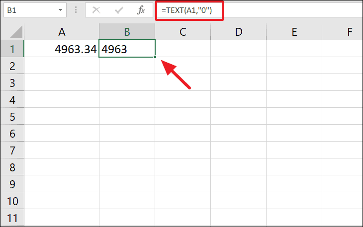 Suppose you have a number in cell A1 and want to display it as a whole number without decimal places. Use the following formula:
