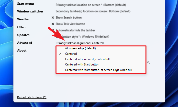 To change the position of the Taskbar on your screen, click on 'Primary taskbar location on screen' and select your desired location from the drop-down menu. Since this change requires restarting File Explorer, click on the 'Restart File Explorer' button located at the bottom-left corner of the settings window.