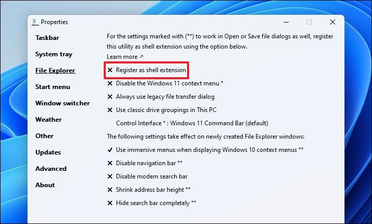 Once registered as a shell extension, you can toggle settings like hiding the navigation bar, search bar, or adjusting the address bar height by clicking on the respective options.