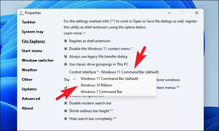 To switch the ribbon menu in File Explorer back to the Windows 10 style, click on 'Control interface' and select 'Windows 10 ribbon menu' from the drop-down list.