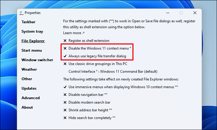 You can also disable the modern Windows 11 context menu and revert to the classic style. Click on 'Disable Windows 11 context menu' to toggle this setting. Similarly, you can enable the Windows 10 file transfer dialog box by clicking on 'Use Windows 10 file transfer dialog'. Remember that enabled options display a checkmark, while disabled ones show a cross.