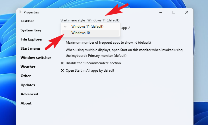 To change the Start menu style back to Windows 10, click on 'Start menu style' and choose 'Windows 10' from the options.