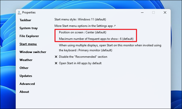 To disable the 'Recommended' section in the Start menu or to have it open directly to the 'All apps' view, toggle the 'Disable Recommended section' and 'Open Start to All apps by default' options.