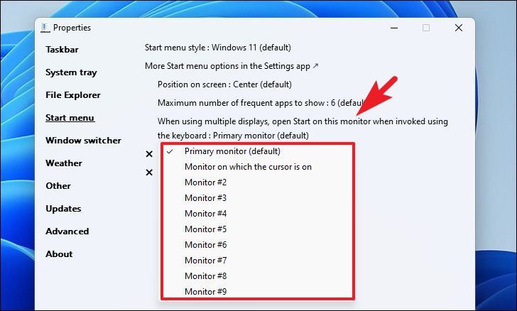 If you have multiple monitors and want the Start menu to appear on a specific screen when you press the Win key, click on 'Monitor to show Start menu' and select the desired monitor from the list.