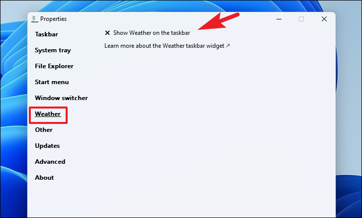 To display the Weather widget on the Taskbar, navigate to the 'Weather' tab and toggle the 'Show weather on the taskbar' option.