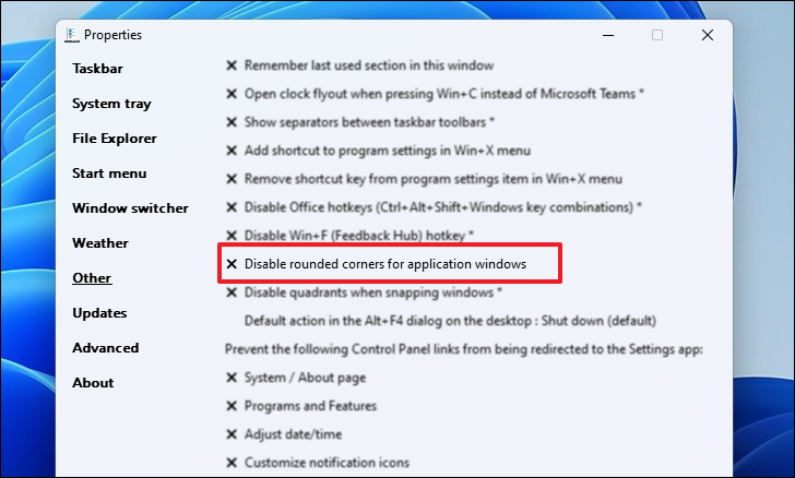 To revert to angular corners and disable the rounded corners of application windows, click on 'Disable rounded corners for application windows' in the 'Other' section.