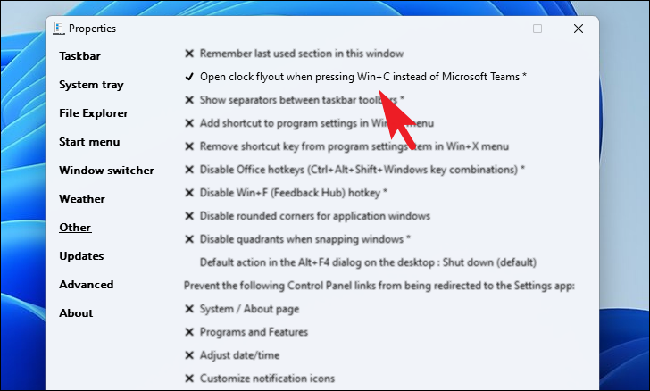 If you'd prefer the Win + C keyboard shortcut to open the Clock instead of Microsoft Teams, click on 'Open clock flyout when pressing Win + C instead of Microsoft Teams' under the 'Other' tab.