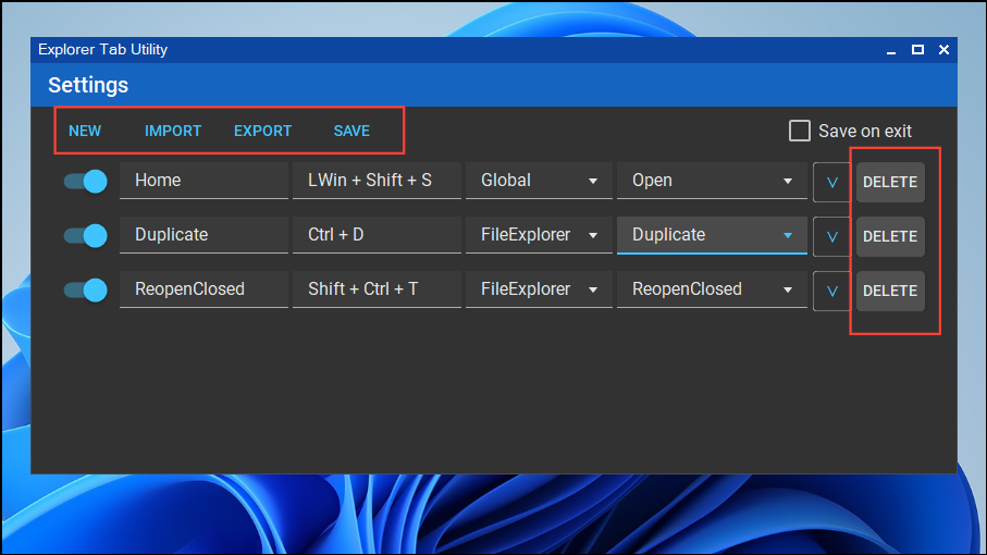 - You can delete hotkeys using the buttons on the right, or import, export, and save your customizations using the options at the top.