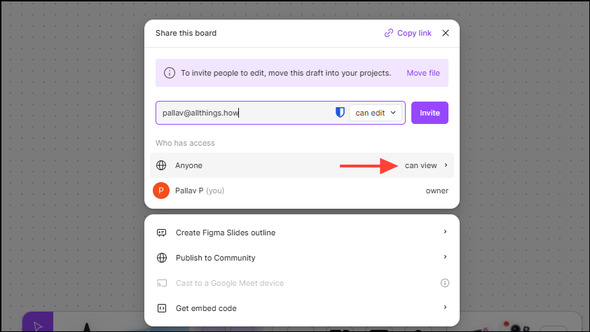 - You can control how collaborators can interact by clicking the 'Can view' option below the Invite button.