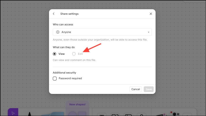 - Then click on 'Edit' to allow the collaborators editing privileges or 'View' if you only want them to be able to view the file. You can also control who has access to the whiteboard from here and set a password for additional security.