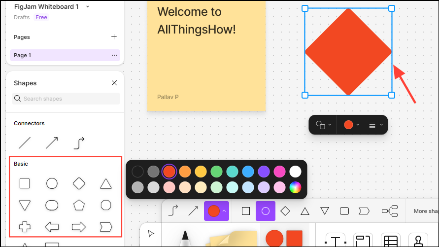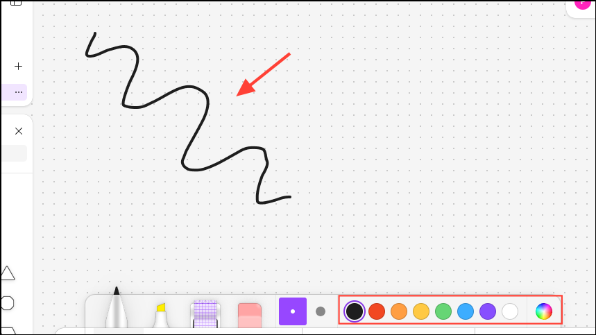 - Select the shape you want to draw from the Tools panel before clicking and dragging on the whiteboard to create it. You can also change the size and color of the shape from the panel. Additional shapes will appear on the left when you click on 'More shapes' on the Tools panel.