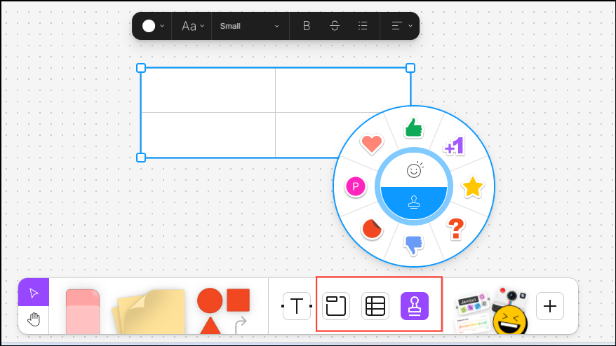 - Other tools include the Section tool, which lets you create sections on the whiteboard for different purposes, the Table tool for creating tables, and the Stamp tool for adding stamps like Thumbs Up, Heart, Star, etc. Keep in mind that emojis are temporary and designed to help collaborators express reactions, while stamps are permanent.