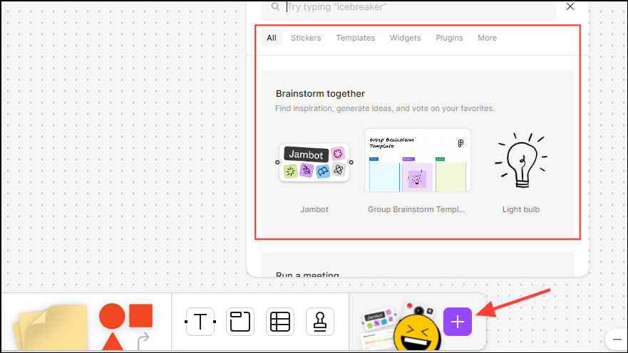 - The last tool lets you search the Figma community for stickers, templates, plugins, and more and add them to your whiteboard.