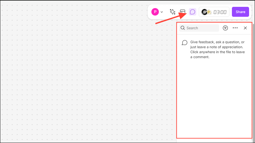 - Click the speech bubble icon at the top right to activate the Comment tool. You can view all comments from collaborators on the right panel and can ask for feedback, ideas, and questions using comments.