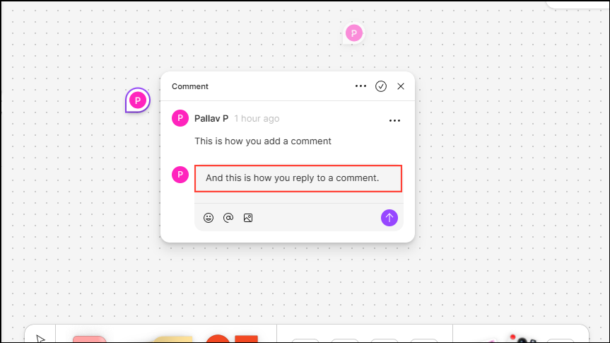 - To add your own comment, click anywhere on the whiteboard after selecting the Comment tool. You can then type in your comment in the comment field.