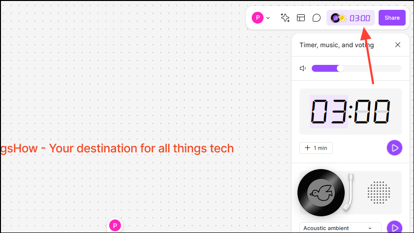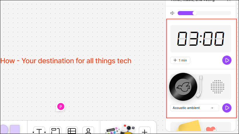- The Widgets panel will appear on the right. You can use the Timer widget during ideation or brainstorming sessions and can even add music to the sessions.