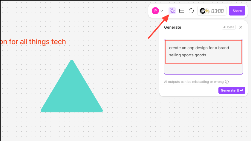 - Finally, there is AI Generator, which lets you generate concepts like flow charts using text right within Figma. Simply click the button and type what you want to generate in the text box before hitting Enter.