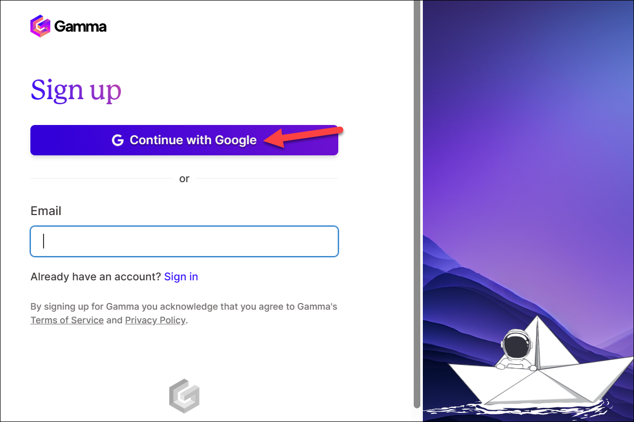 To get started, navigate to gamma.app using any browser on your computer and click the 'Sign Up for free' button.